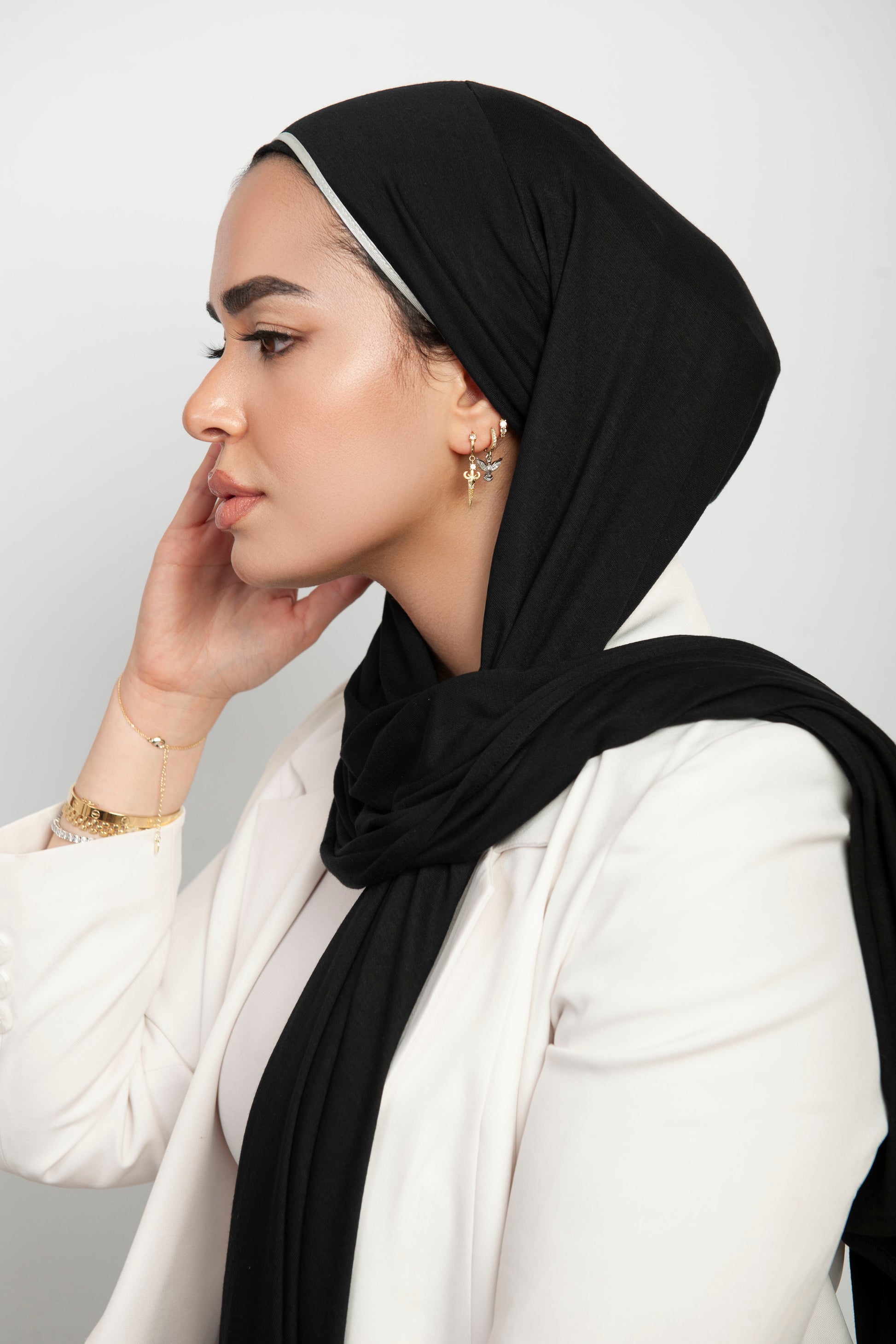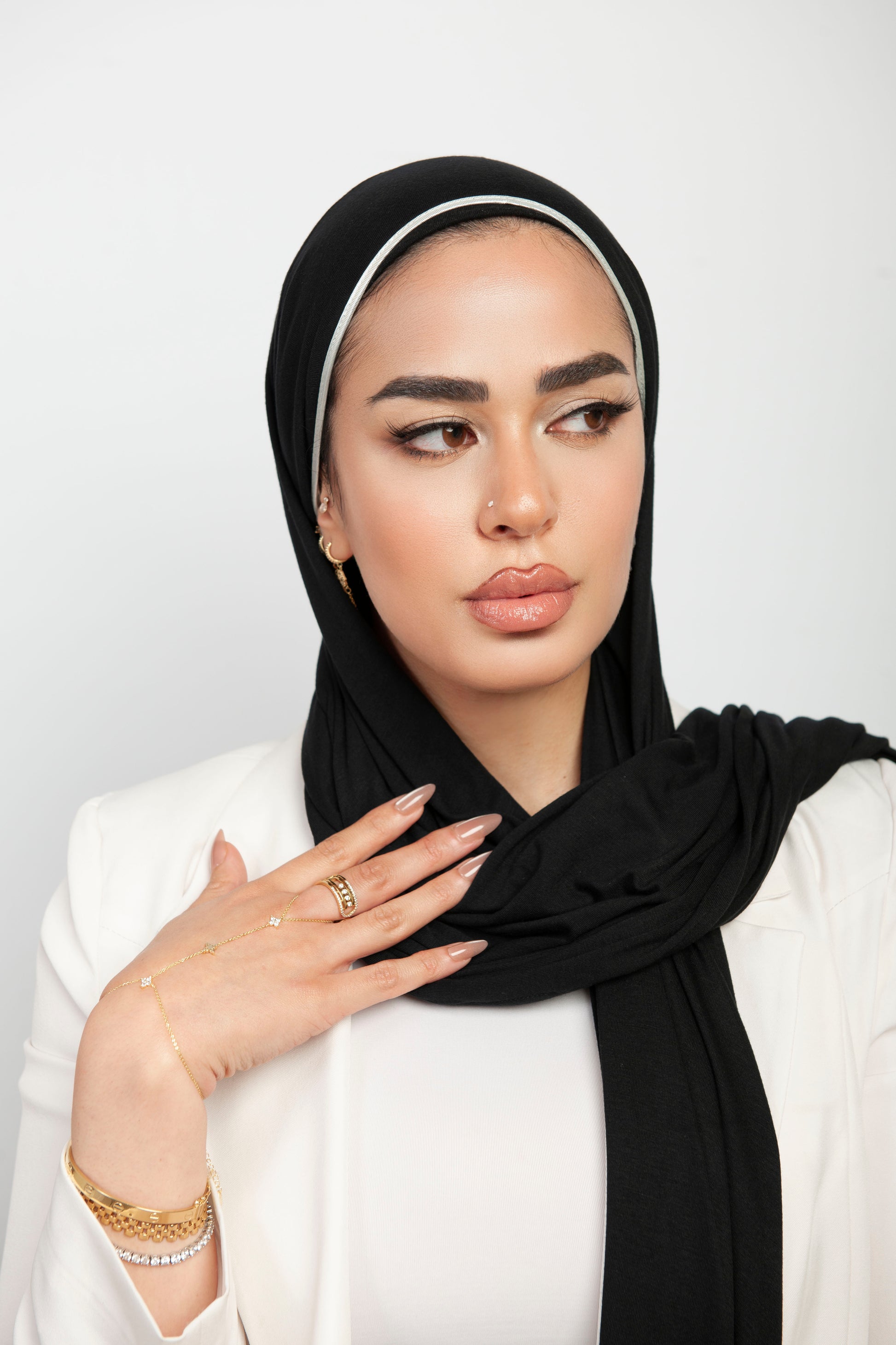 ارتقي بإطلالتك اليومية مع هذا الحجاب المصنوع من ليكرا الجيرسي والمزوّد بحافة ذهبية أو فضية أنيقة مع باندانا مسبقة الربط