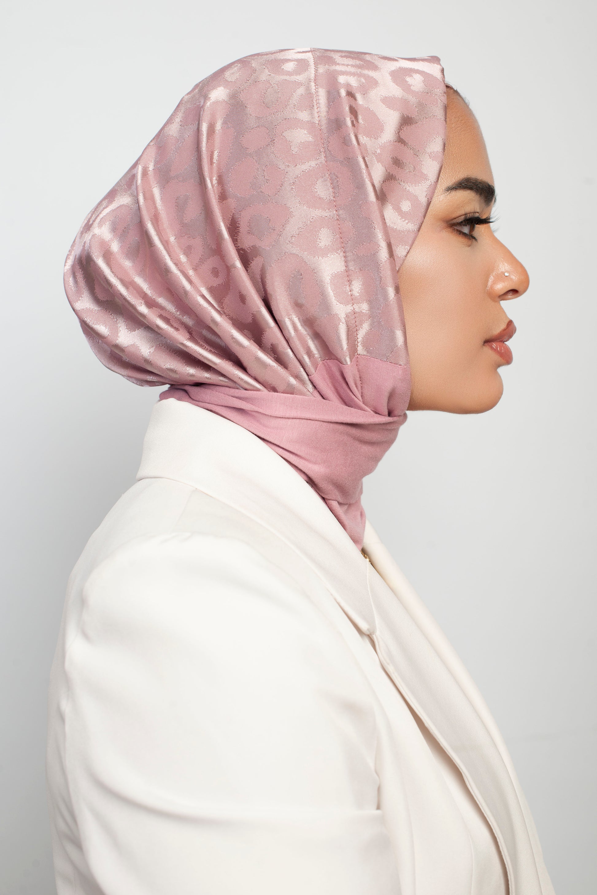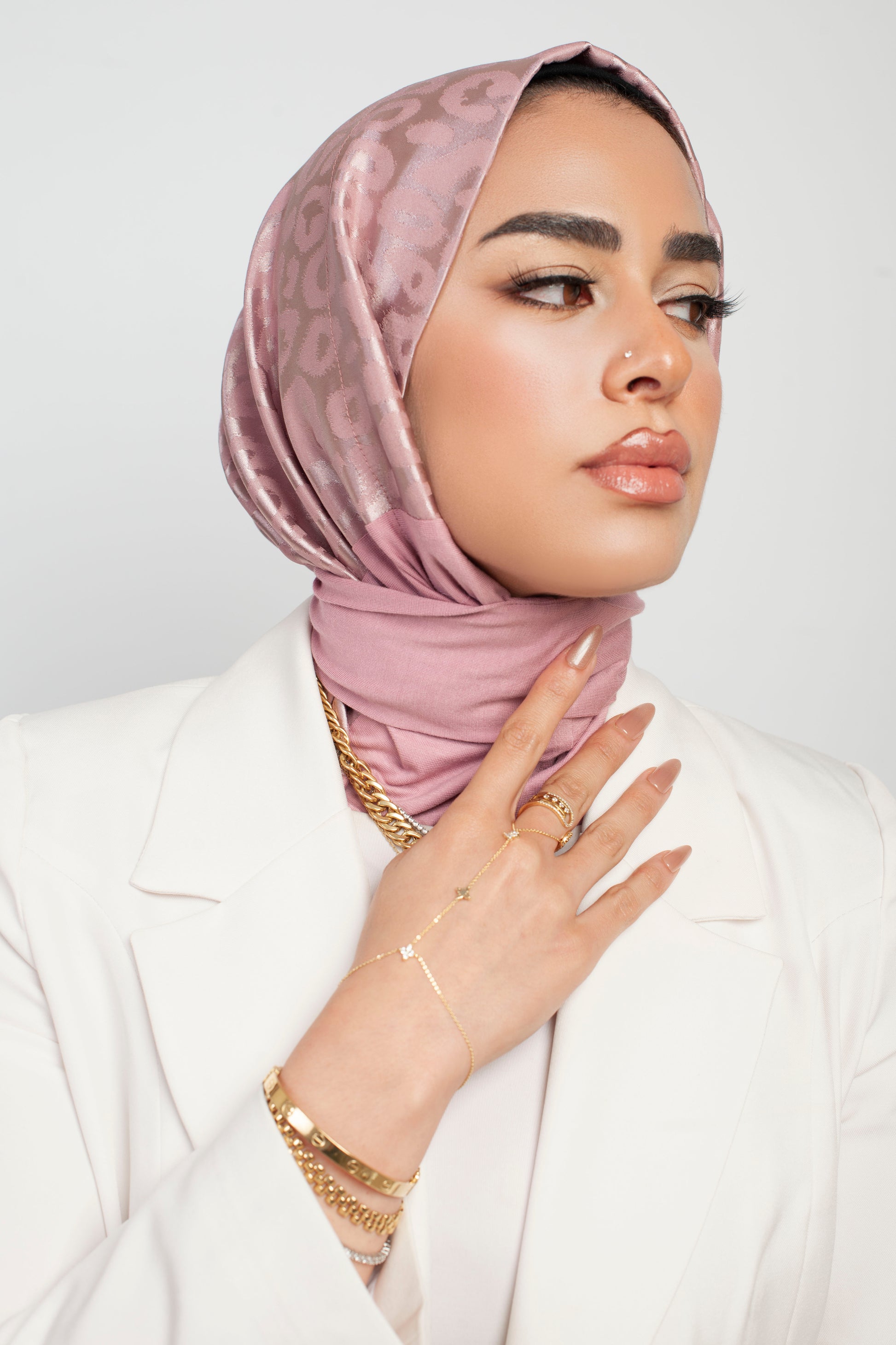 قماش ساتان جاكار أنيق – مصنوع من ساتان جاكار فاخر، يمنح هذا الحجاب الفوري ملمسًا ناعمًا وحريريًا مع لمعان خفيف وملمس مميز لمظهر فاخر.